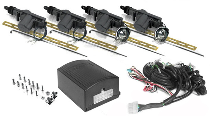 KEETEC centrálne zamykanie na kľúč pre 4-dvere, 2 ks päťvodičové servo, 2 ks dvojvodičové servo, riadiaca jednotka, kabeláž, plechy, tiahla